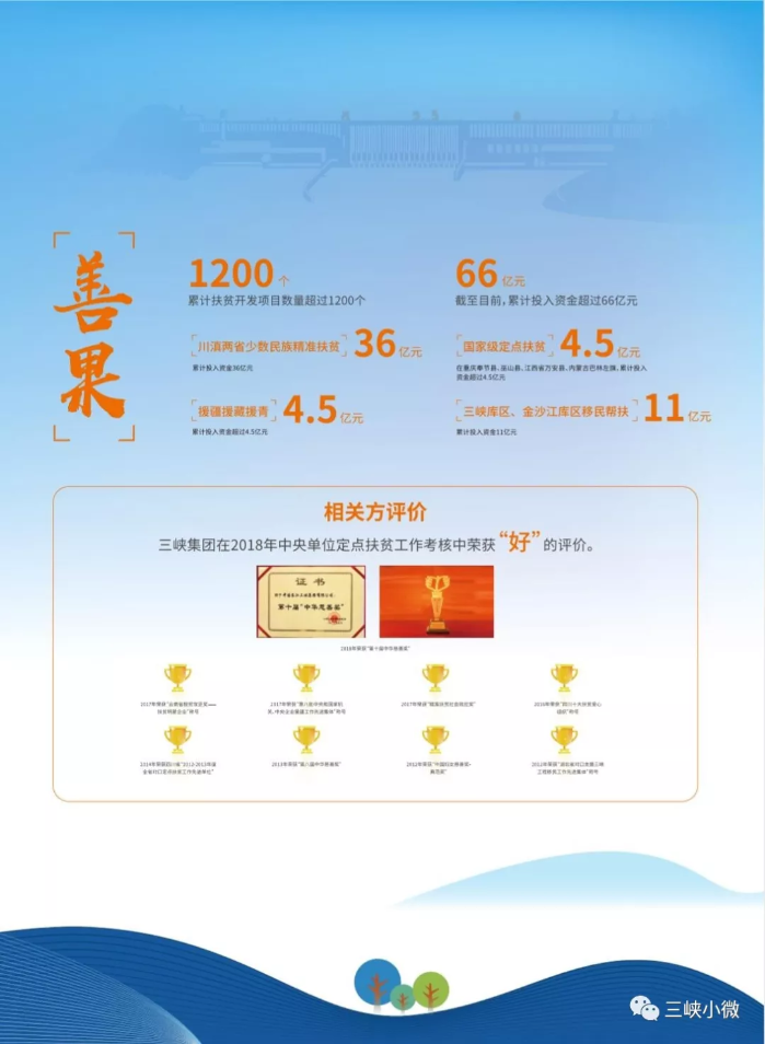 多年來,三峽集團在做強做優做大的同時,積極開展定點扶貧、對口支援、援疆援藏援青、川滇少數民族幫扶、庫區移民幫扶等工作,努力讓改革發展成果惠及廣大人民群眾。截至目前,三峽集團累計投入扶貧和幫扶資金超過66億元,惠及全國31個省市、84個縣區旗、12個少數民族。其中,長期定點幫扶的巫山縣、奉節縣、萬安縣均已脫貧出列,巴林左旗有望今年實現“摘帽”;投入36億元支持云南省怒族、普米族、景頗族3個人口較少民族和四川省涼山彝區脫貧攻堅,已幫助15萬多貧困群眾實現脫貧。
