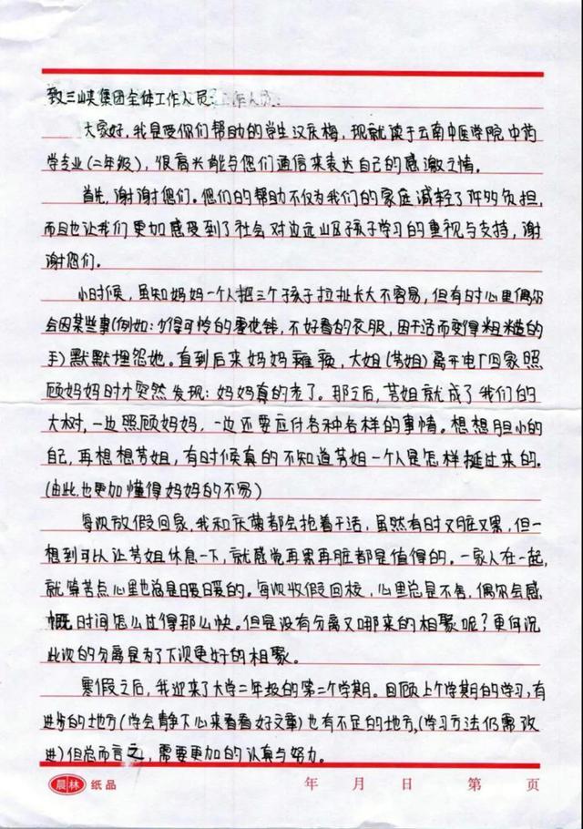 2017年2月24日,還在就讀云南中醫(yī)學(xué)院中藥專業(yè)的她,給三峽集團(tuán)寄來了一封感謝信,言辭語句中表達(dá)著對三峽集團(tuán)幫助的感激和對未來生活的向往。其中一段“大山里的孩子,雖沒有碰過城里人玩過的東西,沒嘗過城里人吃過的東西,但他們?nèi)杂凶约旱目鞓罚偰馨盐⑿煸谀樕希路鹱约菏沁@世上最幸福的人”最令人動容。